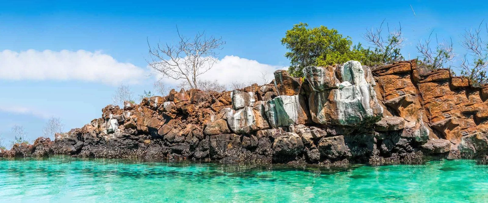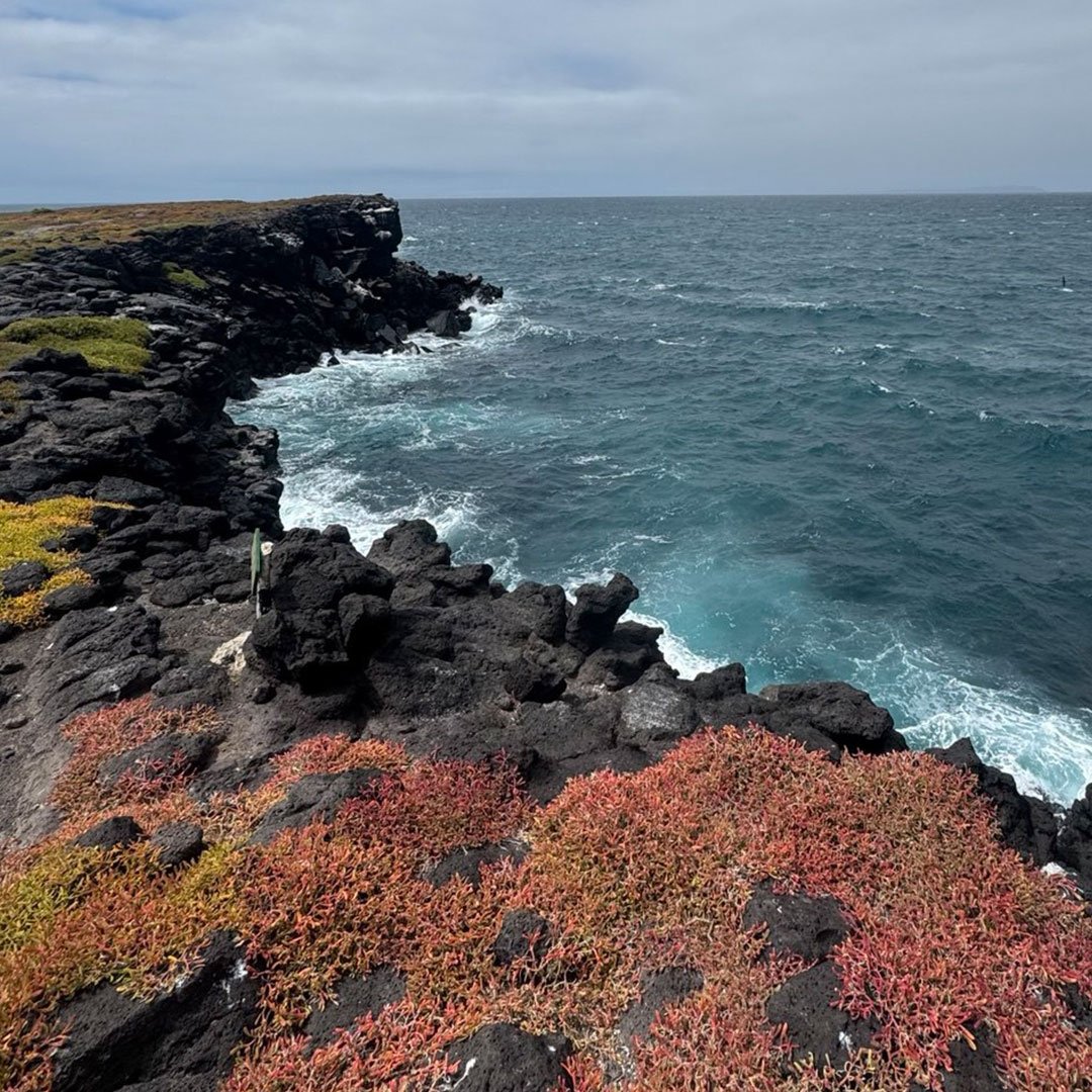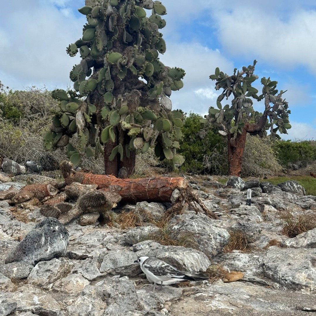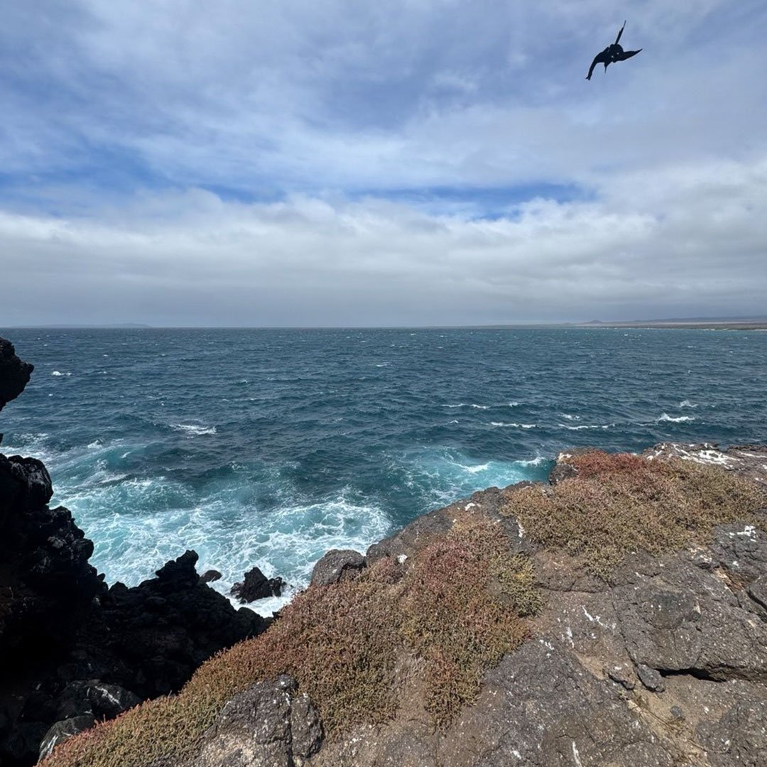 También veremos paisajes con acantilados donde los petreles, pájaros tropicales y gaviotas de cola bifurcada hacen sus nidos. Mientras seguimos la caminata, podremos observar iguanas terrestres e iguanas marinas que, en tiempos de copulación, se mezclan, dando origen a la iguana híbrida. Además, veremos cactus gigantes y pinzones de Galápagos.